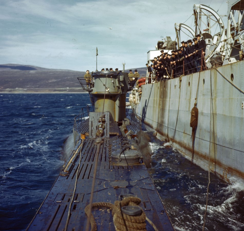 HMCS U-889 coming alongside HMCS Joliette (K418), Shelburne, Nova Scotia.