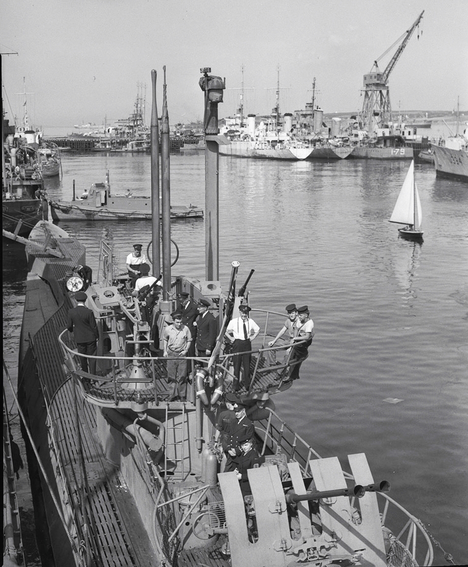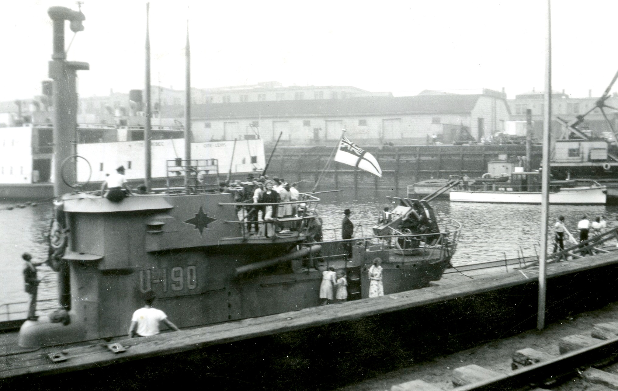 HMCS U-190 alongside at Quebec, ca late 1945. The submarine was  open to visitors.