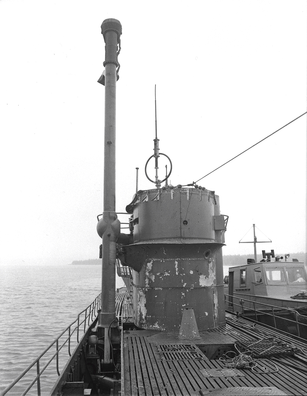 View looking aft showing Schnorkel of German submarine U-889 in raised position, 25 May 1945.