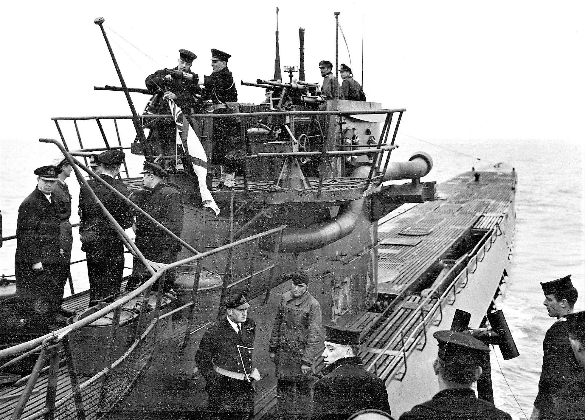 U-744, surrendering after a 32 hour running battle in the North Atlantic in March 1944.  It sank shortly afterwards. This March 1944 photograph shows Allied sailors boarding the German U-Boat (submarine) U-744 following the second-longest submarine hunt of the Second World War.