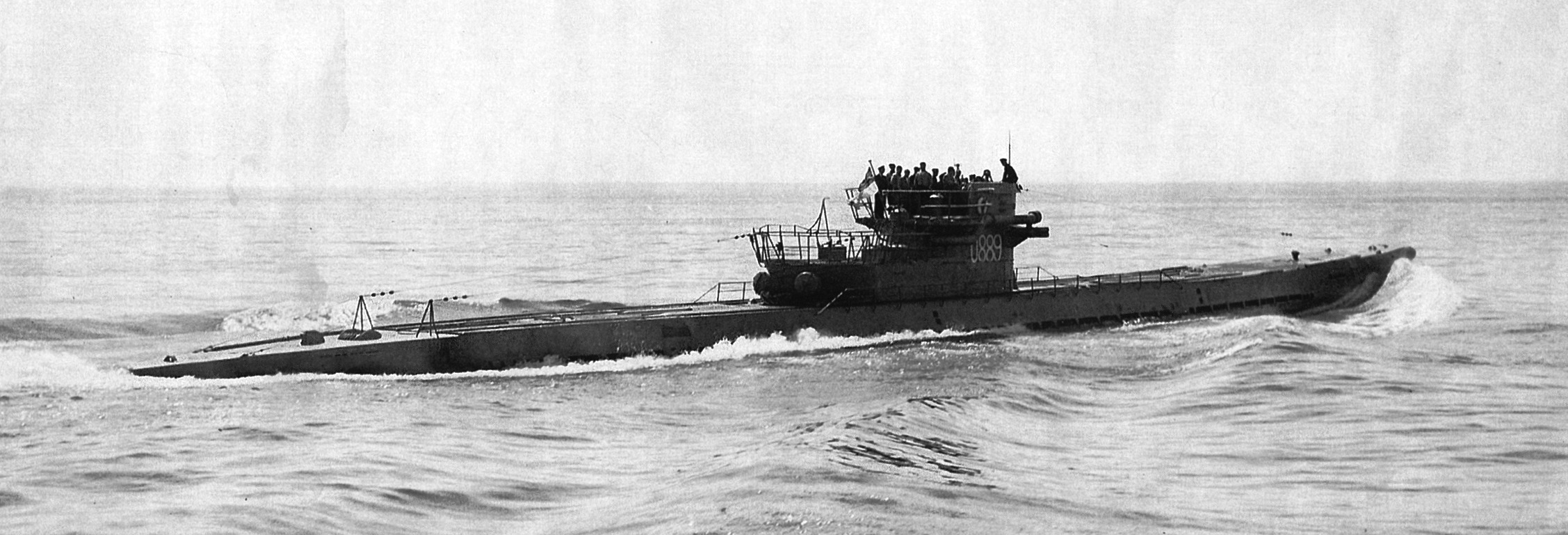 U-889 was commissioned into the Royal Canadian Navy as HMCS U-889 on 14 May 1945, and used for testing and evaluation.  This was one of the most modern and technically advanced submarines in the world and the navy was interested in examining the U-boat in detail.  Of particular interest were her acoustic torpedoes and highly developed German GHG hydrophone array.  U-889 was one of 10 U-boats assigned to the USA.  As a result, a Canadian crew sailed with her on 11 Jan 1946 for Portsmouth New Hampshire.  HMCS U-889 was paid off on 12 Jan 1946 and turned over to the USN at Portsmouth, New Hampshire the same day.  The USN conducted experiments on her special hydrophone gear.  After extensive testing off Florida and in the Caribbean, she was scuttled at sea on 20 Nov 1947 off Cape Cod by USN submarine USS Flying Fish.