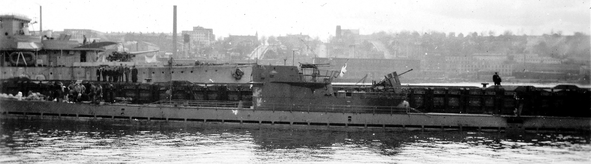 U-190, St Johns, Newfoundland, ca May 1945.  HMCS Hawkesbury K415 across the harbour behind U-190.