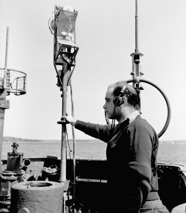 RCN rating examining the portable radar detector, direction finder and field strength recorder on the bridge of HMCS U-889, Halifax, Nova Scotia, 25 May 1945.