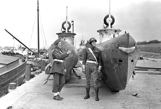 German two-man “Biber” submarines guarded by two Canadian Military Policemen, Lance-Corporals J. Lang and P.C. Ajas of No. 1 Provost Company, Canadian Provost Corps (C Pro C), IJmuiden, Netherlands, 25 May 1945.