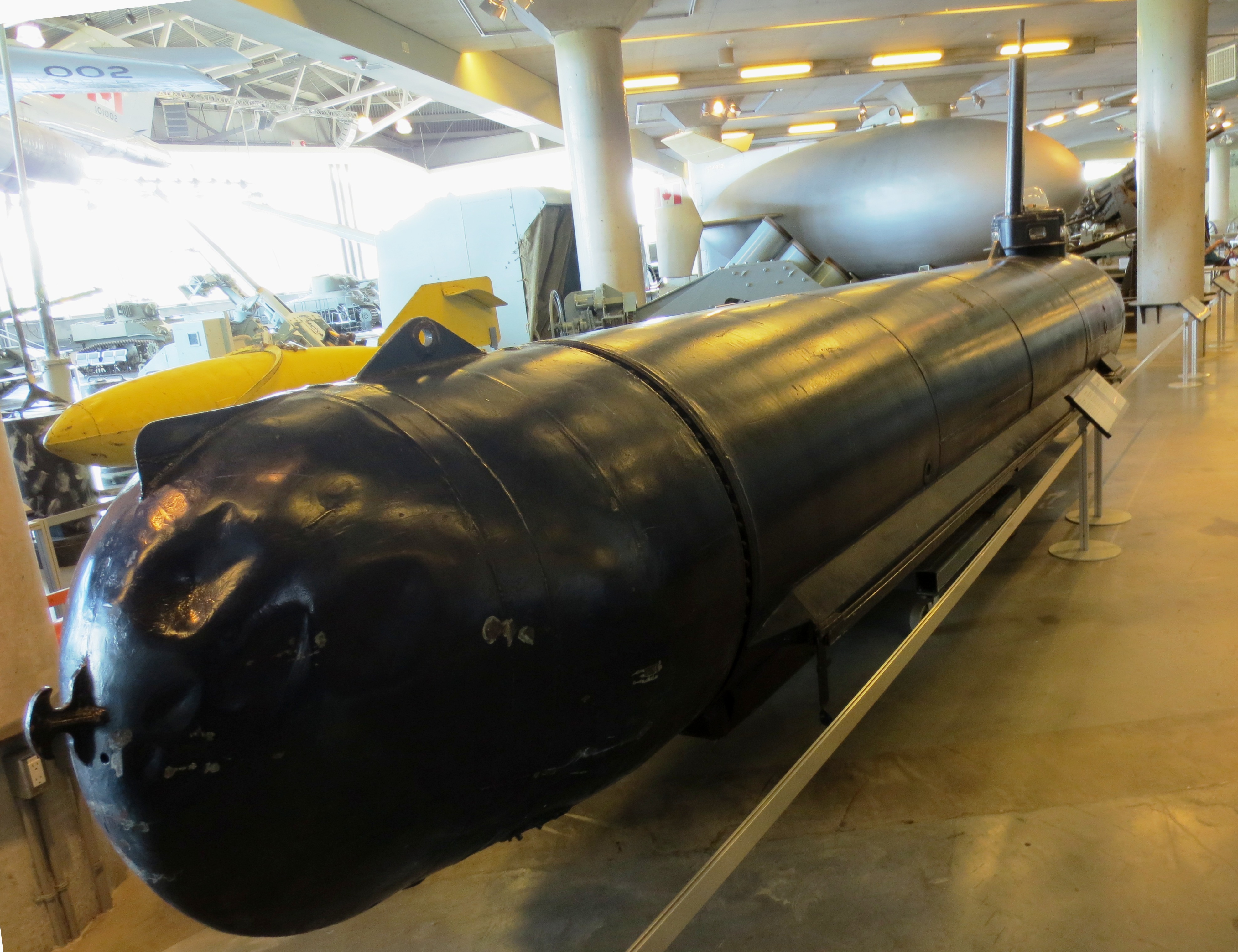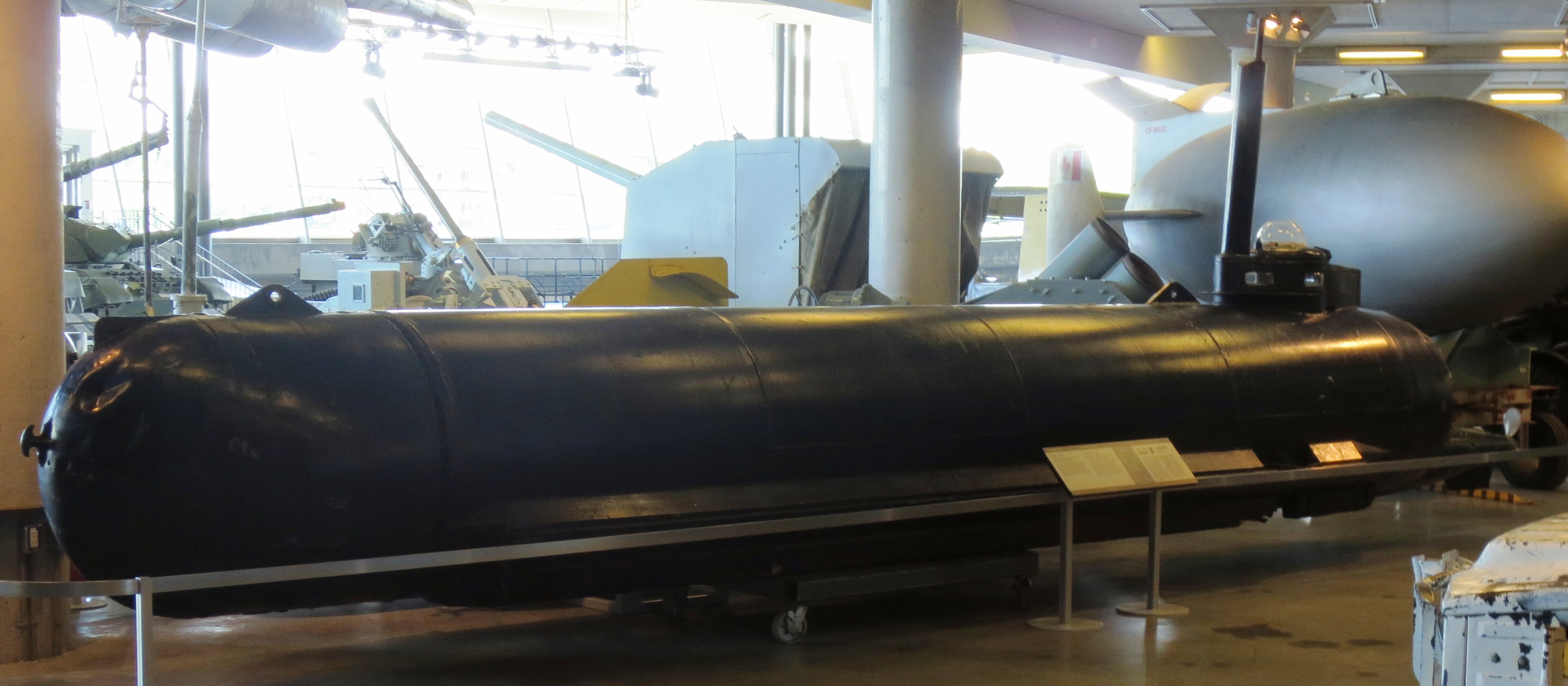 German Second World War Kriegsmarine Molch one-man mini-submarine War Prize, on display in the Canadian War Museum, Ottawa, Ontario.  This submarine was brought to Canada by Farley Mowat’s Intelligence Collection Team in 1945. Built in 1944, it was the first mini-submarine of Nazi Germany’s Kriegsmarine, but was not successful in combat operations and suffered heavy losses.
