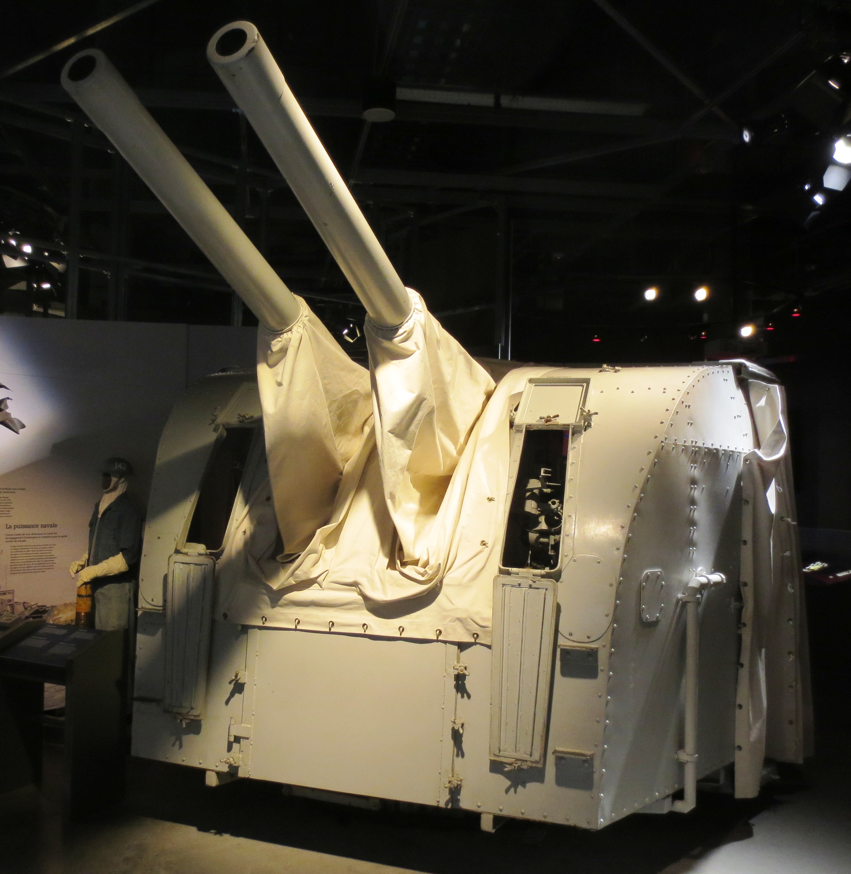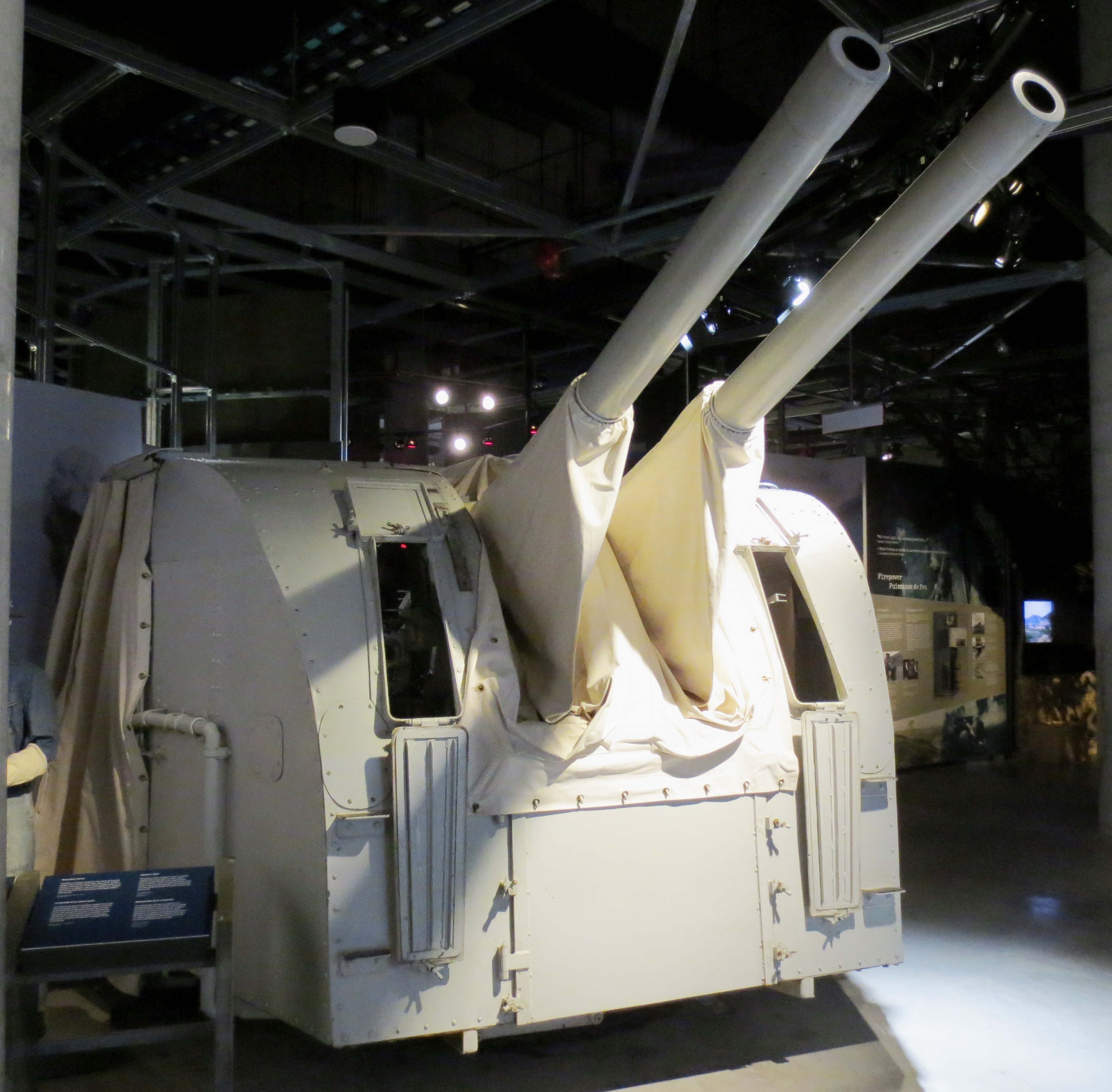 4-inch/45 QF Mk. XVI* Twin Guns (Serial No. S/15025), L, left, and (Serial No. S/14512), R, right, on a Mk. XIX High Angle mounting (Serial No. unknown), from HMCS Victoriaville. During the Second World War, the 4-inch Mk. XVI naval gun, in a twin Mk. XIX high-angle mounting, was the main armament of many British and Canadian destroyers and frigates. They were also the secondary, anti-aircraft guns used on British battleships and cruisers. Canada manufactured over 600 of the 2,555 Mk XVI guns produced during the war. This particular gun mounting was a product of Trenton Industries Ltd., in Trenton, Nova Scotia.