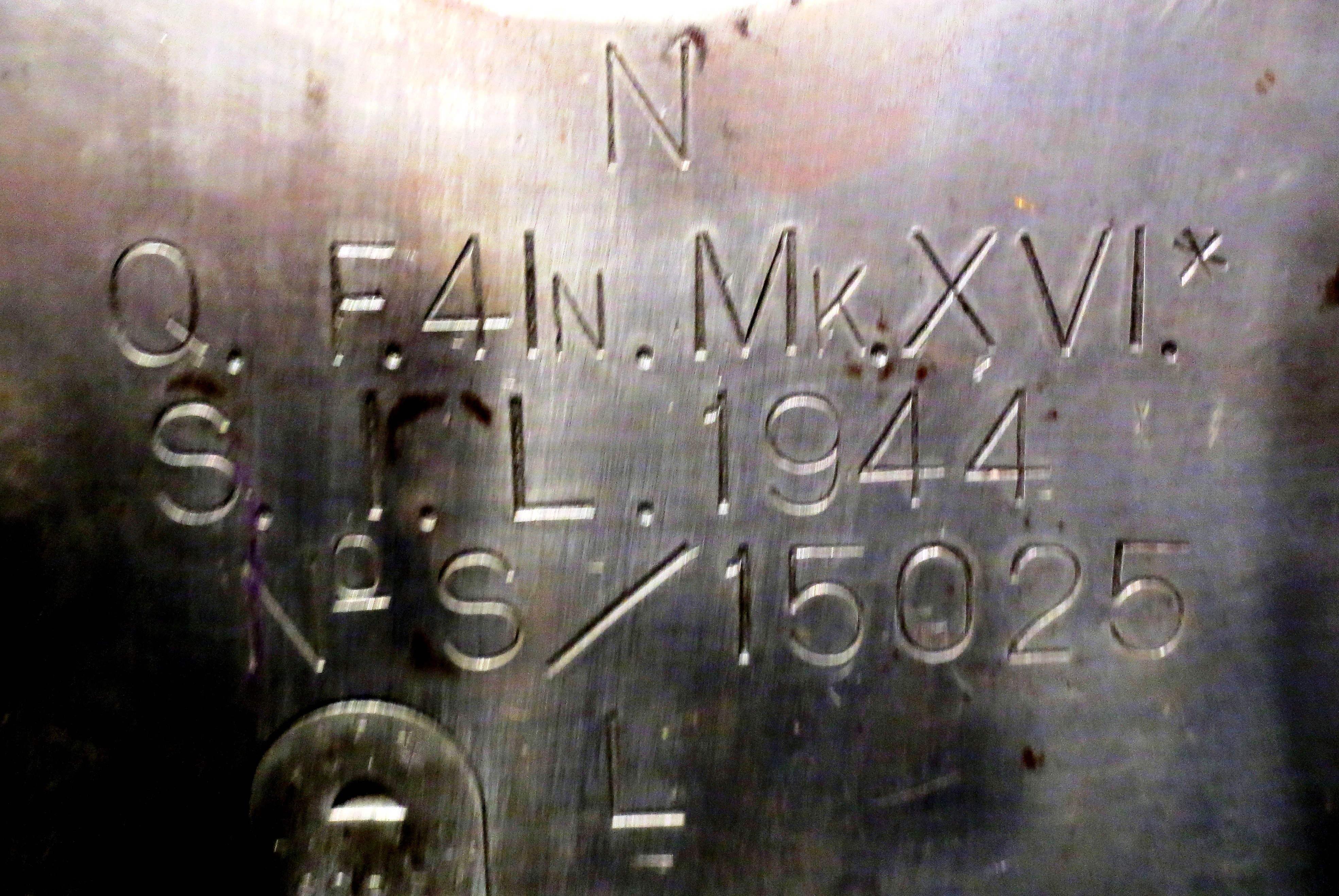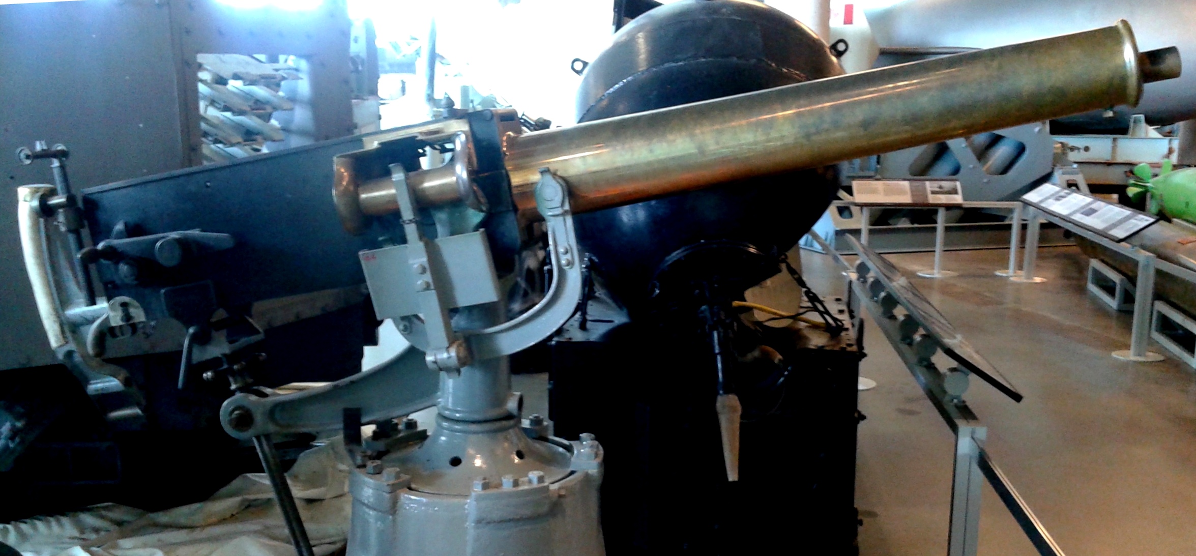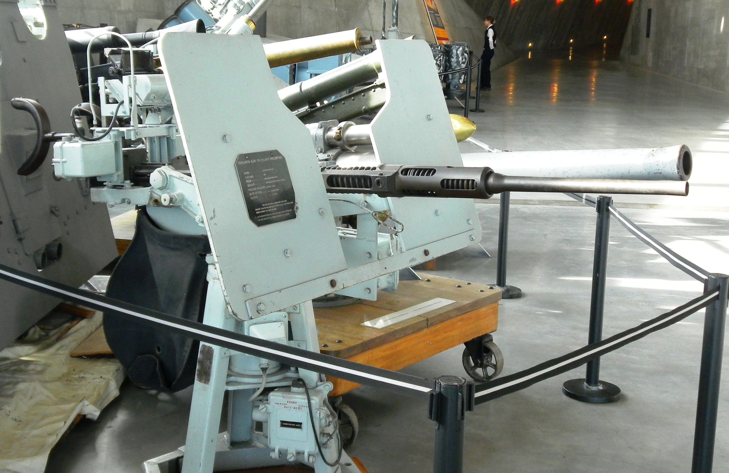 40-mm/39 2-pounder Mk. VIII single, V.S.M. (Vickers, Sons & Maxim LL) Automatic Gun, (Serial No. S9463/14786), on Single Mounting, aka “pom-pom”, from HMCS Kamloops. Before the Oerlikon 20-mm anti-aircraft gun became available in quantity, the 2-pounder Mk. VIII gun was the Royal Canadian Navy’s main defence against low-flying aircraft. In addition to British production, the Dominion Bridge Co. Ltd, in Vancouver, BC, manufactured 843 guns during the Second World War, starting in September 1942. The Canadian Locomotive Co., Kingston, Ontario produced the 2-pounder Mk VIII single mounting. The mounting was comparatively light, of an orthodox type with riveted carriage and presented no special manufacturing difficulties. A total of 455 had been delivered by 30 September 1943, and production was continuing at the rate of 30 mountings per month. The 2-pounder gun was mounted on the Flower class corvettes. The CWM artefact was mounted on HMCS Kamloops. The ship and the gun appeared in the movie “Corvette K-225” starring Randolph Scott in 1943. CWM 19750084-029.