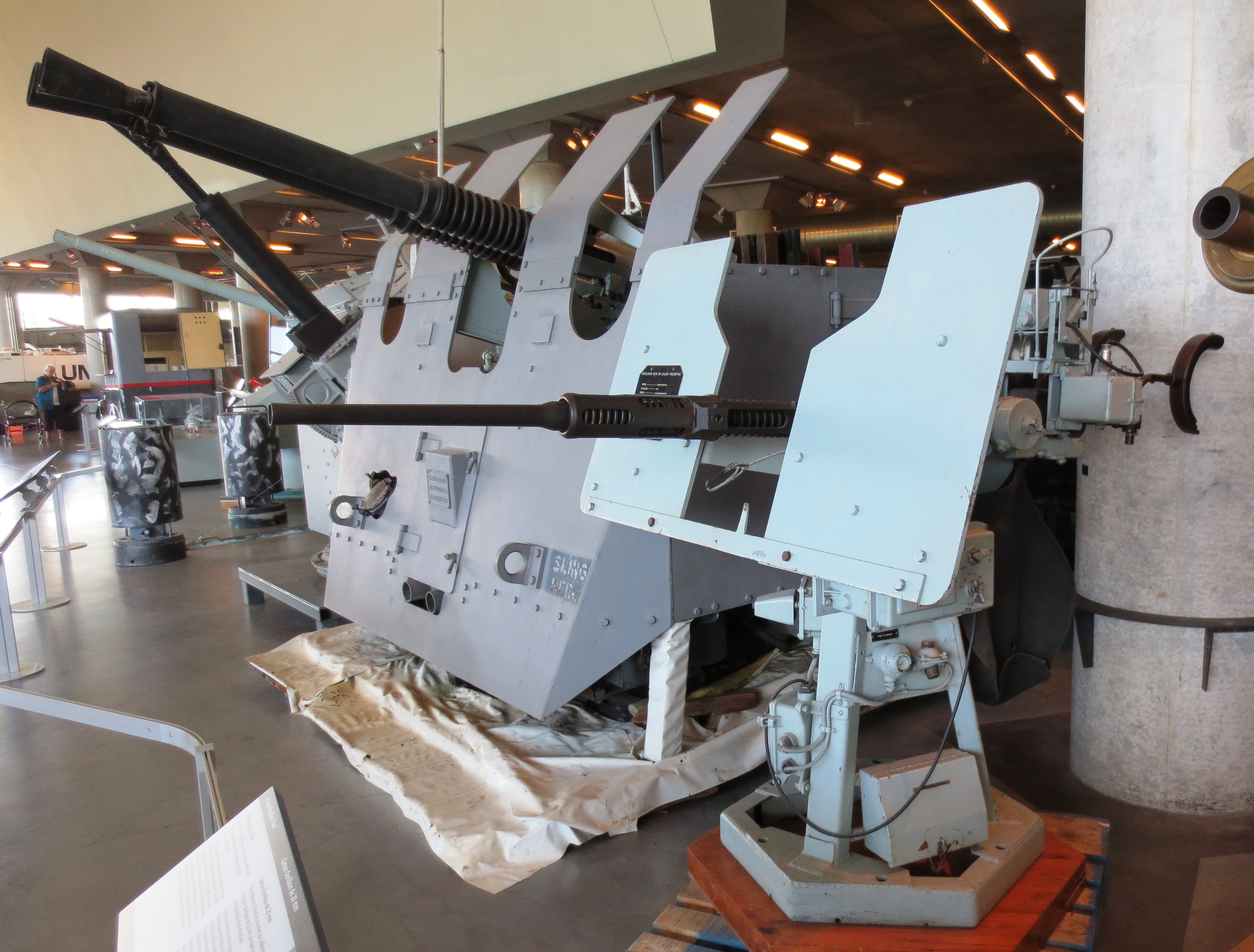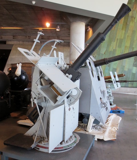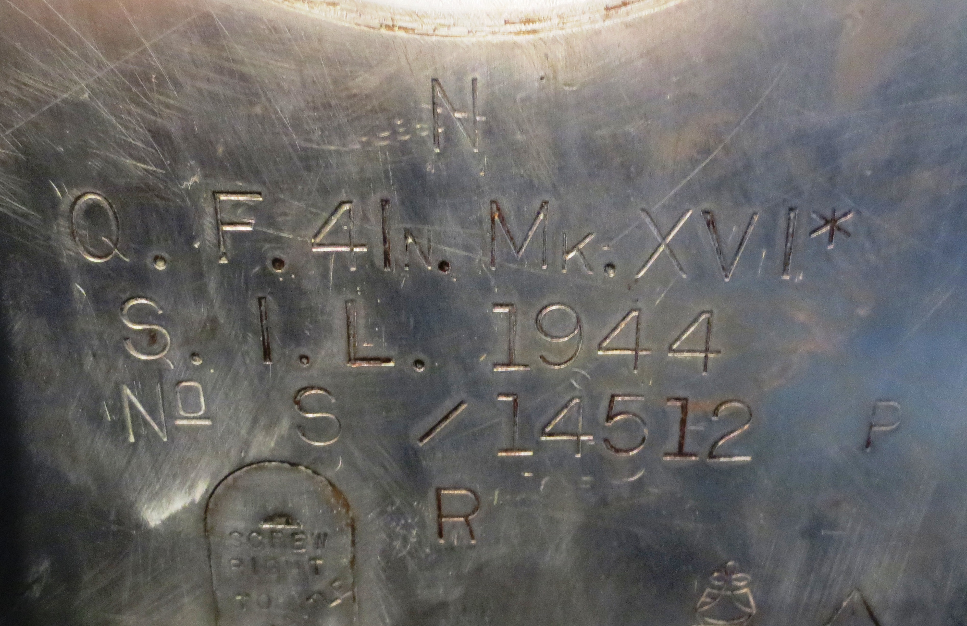 40-mm/39 2-pounder Mk. VIII single, V.S.M. (Vickers, Sons & Maxim LL) Automatic Gun, (Serial No. S9463/14786), on Single Mounting, aka “pom-pom”, from HMCS Kamloops. Before the Oerlikon 20-mm anti-aircraft gun became available in quantity, the 2-pounder Mk. VIII gun was the Royal Canadian Navy’s main defence against low-flying aircraft. In addition to British production, the Dominion Bridge Co. Ltd, in Vancouver, BC, manufactured 843 guns during the Second World War, starting in September 1942. The Canadian Locomotive Co., Kingston, Ontario produced the 2-pounder Mk VIII single mounting. The mounting was comparatively light, of an orthodox type with riveted carriage and presented no special manufacturing difficulties. A total of 455 had been delivered by 30 September 1943, and production was continuing at the rate of 30 mountings per month. The 2-pounder gun was mounted on the Flower class corvettes. The CWM artefact was mounted on HMCS Kamloops. The ship and the gun appeared in the movie “Corvette K-225” starring Randolph Scott in 1943. CWM 19750084-029.
