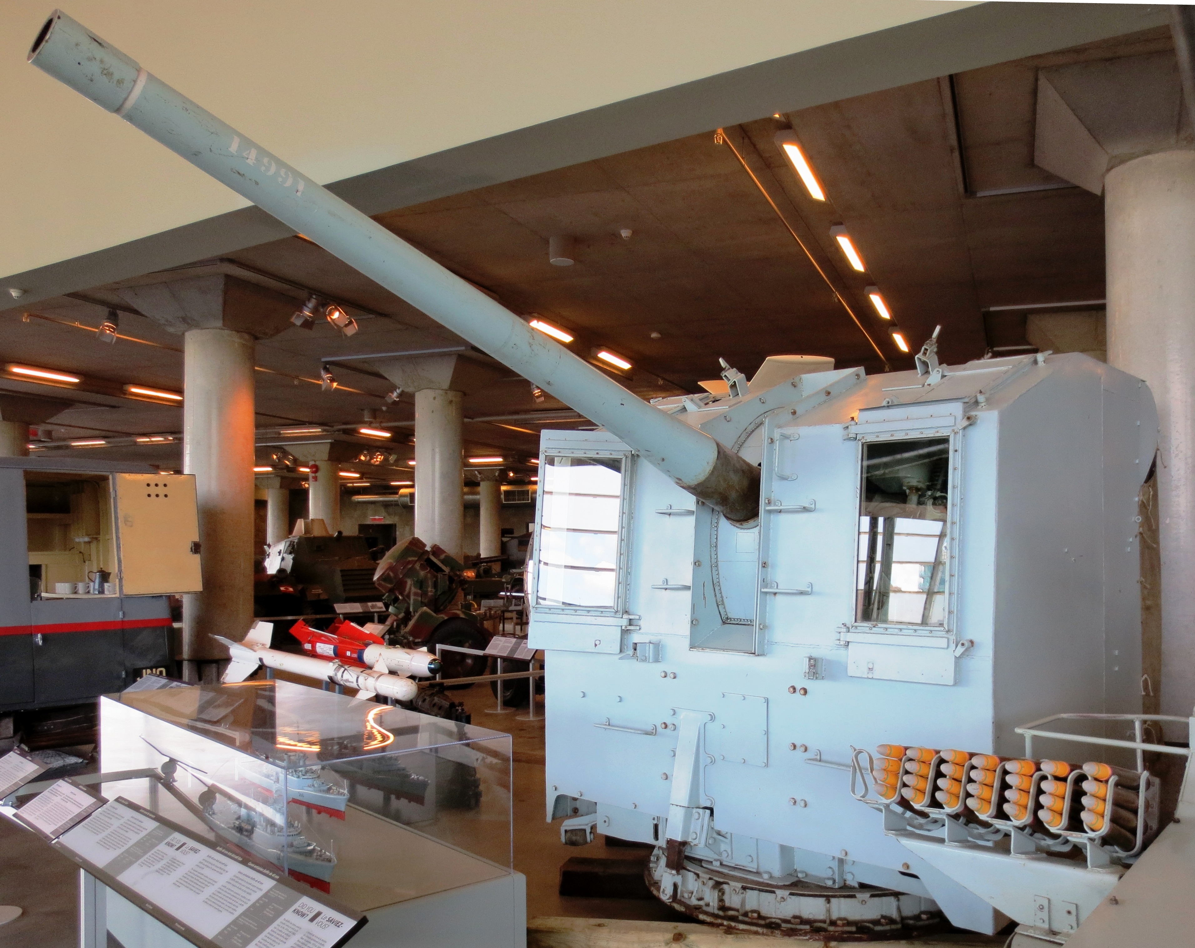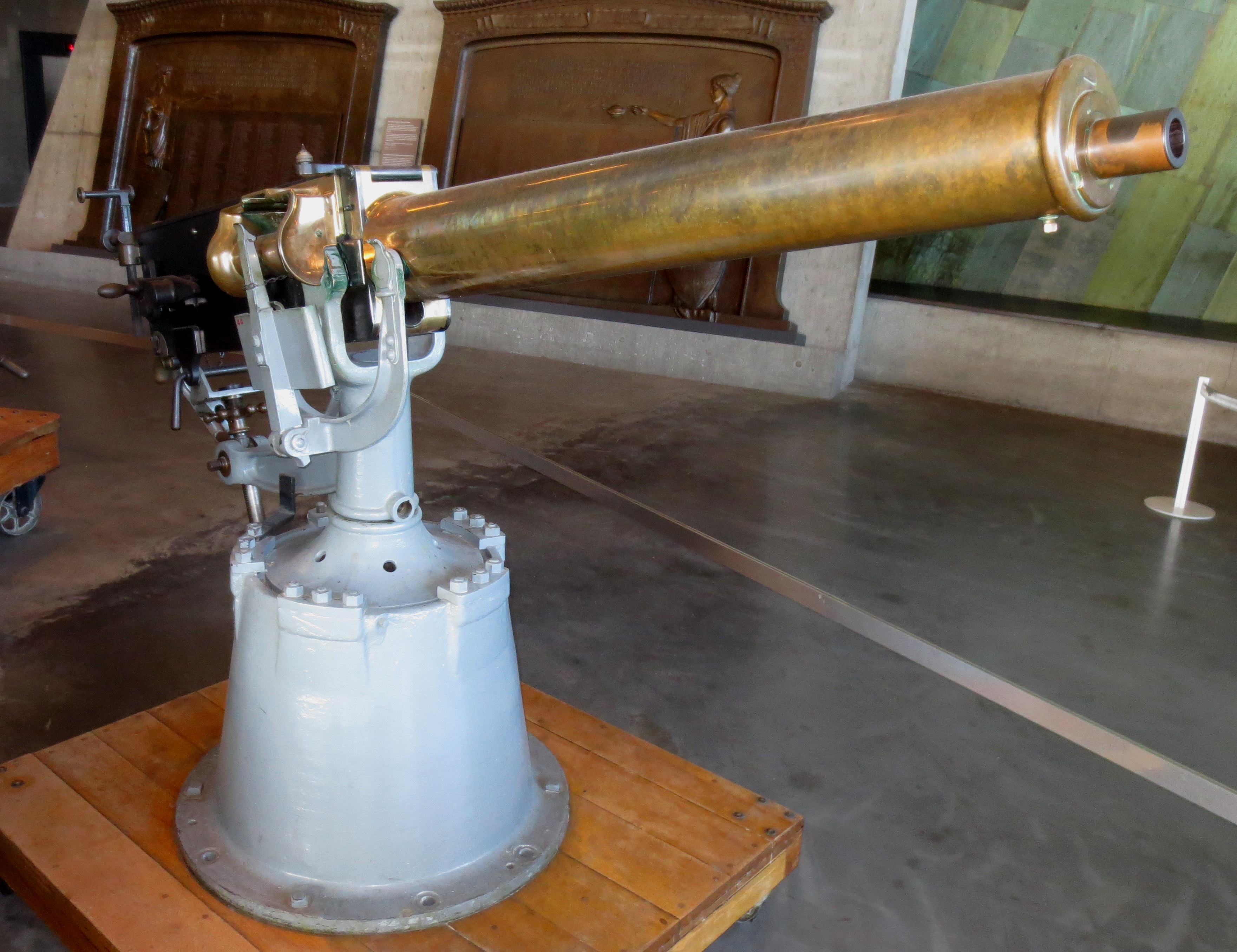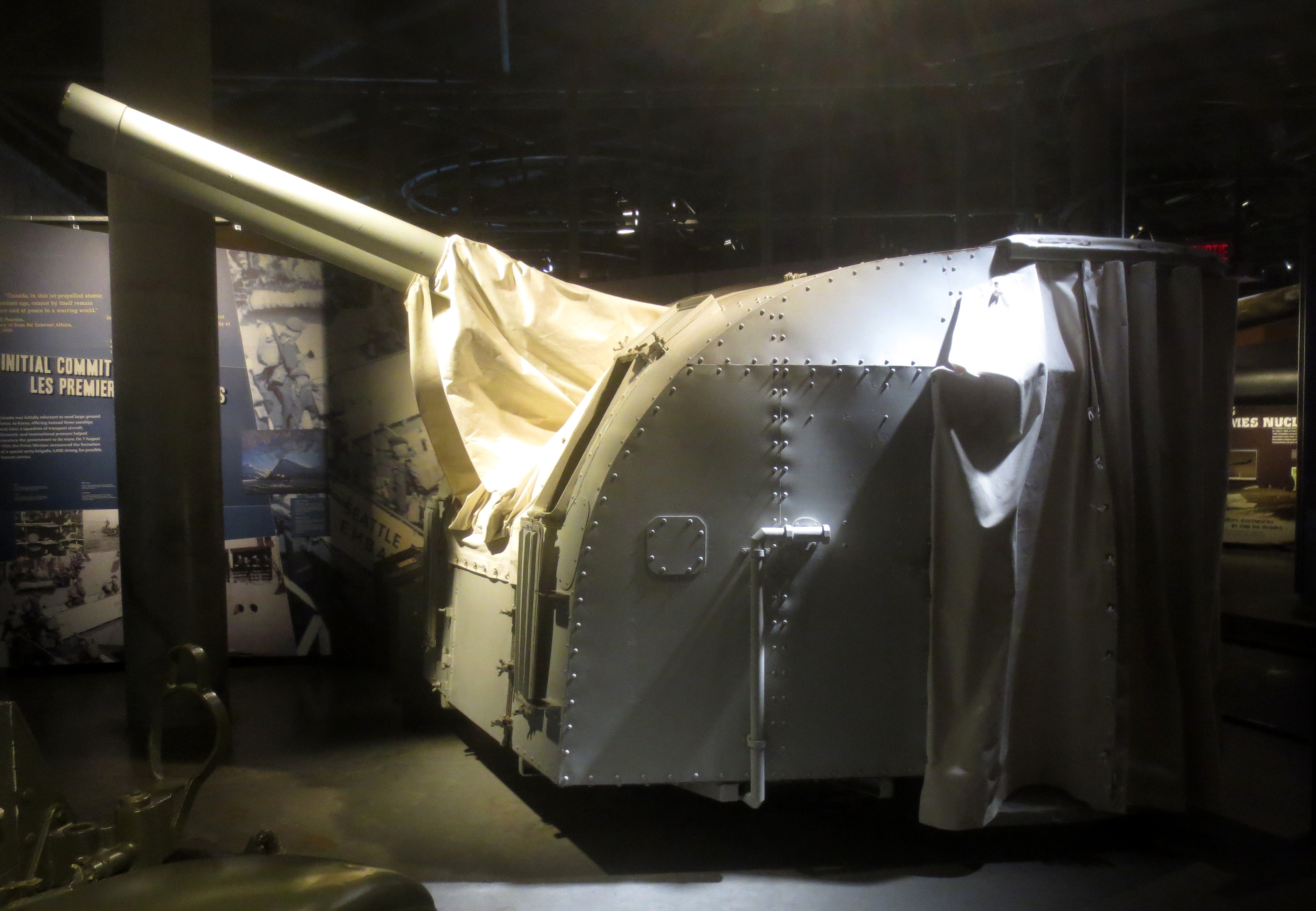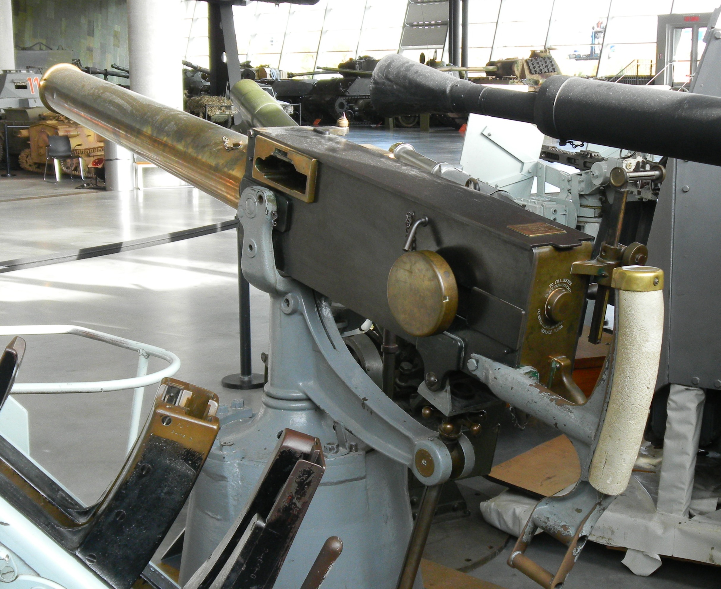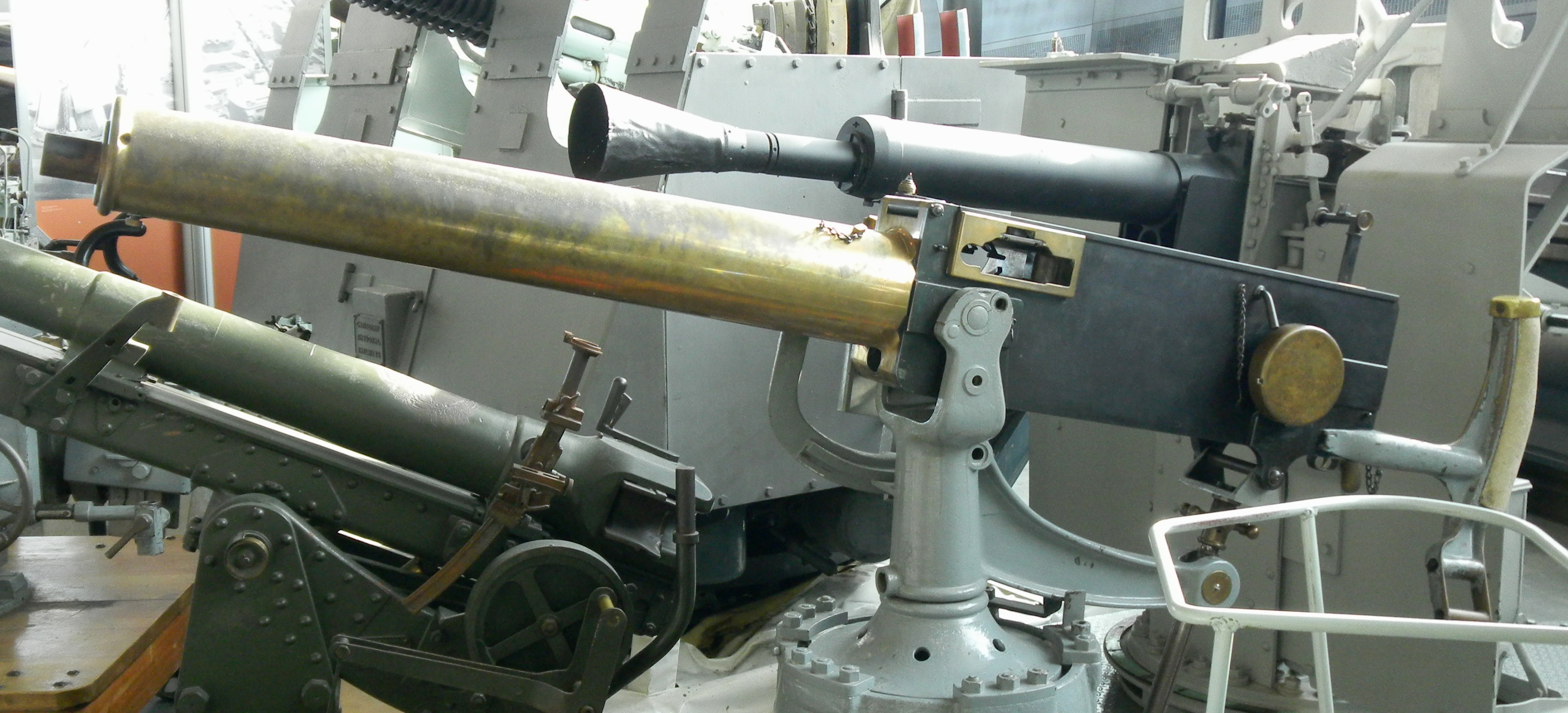 Vickers, Sons & Maxim Ltd 1-pounder Automatic Gun Mk. I, (Serial No. 2496), 1905, weight (410 lbs), Reg. No. 113, aka “pom-pom”, on a Naval deck gun mount. In 1885, the Maxim Gun Company, with the Vickers Company, developed a 37-mm (1.46-in)automatic gun for the Royal Navy for defence against torpedo boats. Although the British only bought a few, Maxim sold many to other countries, including France who later sold them to the Boers in South Africa, who used the gun with devastating effect against the British during the Boer War in 1902. With a rate of fire of 300 rounds per minute, its heavy rapid thumping gave the gun its “pom-pom” nickname, which is still applied to heavy automatic weapons today. Some guns were mounted on high-angle mountings as anti-aircraft defence during the First World War. CWM 19890086-001.