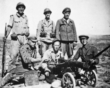 Soviet model .303-inch Maxim Heavy Machine-gun being crewed by Canadians serving with the Mackenzie-Papineau Battalion in Spain ca. 1938. “Mac-Paps” were a battalion of Canadians who fought as part of the XV International Brigade on the Republican side in the Spanish Civil War. Except for France, no other country gave a greater proportion of its population as volunteers in Spain than Canada. The first Canadians in the conflict were dispatched mainly with the U.S. Abraham Lincoln Battalion and later the North American George Washington Battalion, with about forty Canadians serving in each group. The Lincoln Brigade was involved in the Battle of Jarama in which nine Canadians are known to have been killed.
