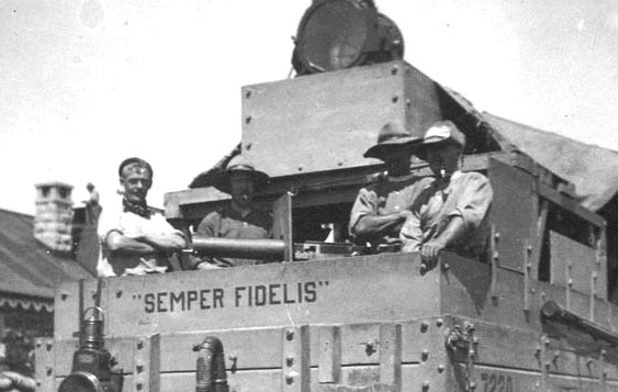 Canadian troops, Company “C” in the South African Constabulary. The “Messenger Boy”, No. 8 Armoured train, named by Devons, showing Maxim Gun, search-light and gun crew.