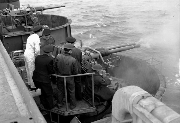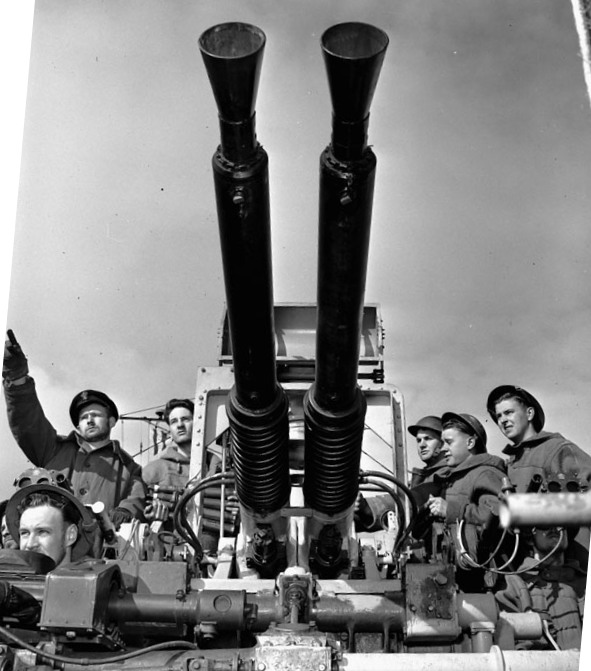 40-mm Bofors Light Anti-Aircraft Guns in a Twin Mount with gunners on board HMCS Algonquin.