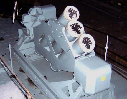 Knebworth Corvus eight-barreled chaff launcher. The eight barrels are mounted in two rows of three crossed at right angles with an additional two above and angled between the lower ones. The barrels are 102-mm in diameter and 1.6 mm long, fixed at 30 degrees. The Corvus chaff launcher is a British shipborne chaff decoy launching system manufactured by Vickers Ltd Group. It is a lightweight, quick reaction system for the self-defence of surface vessels against surface-to-surface and air-to-surface missiles, where chaff dispensing rockets form a radar decoy screen. The Corvus was primarily used on ships of the Royal Navy. The Corvus system was part of the original Electronics Warfare suite of the 280’s. The RCN was equipped with the Mk. 36 SRBOC and then the Plessey Shield and now utilizes a MASS (Multi-ammunition soft kill) system after the FELEX (Frigate life extension) programme on the Halifax class frigates. (Data courtesy of LCdr Neil S. Bell)