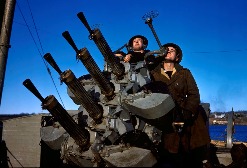 40-mm Bofors Light Anti-Aircraft Guns Mk. XI in a Twin Mount, practice firing on the aircraft carrier HMCS Nabob, Jan 1944.