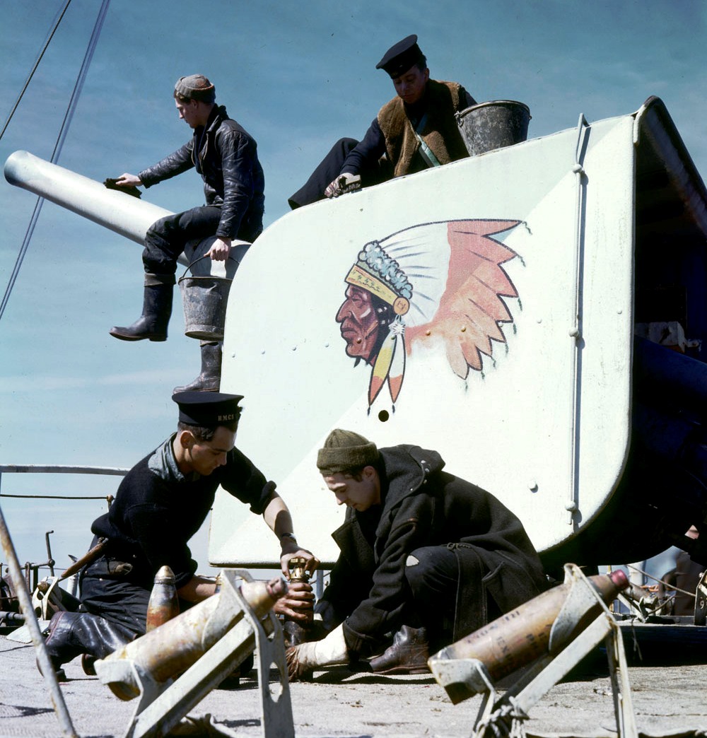 Mixed group of Anti-Aircraft Guns on board HMCS Assiniboine with an unidentified Royal Navy destroyer taking over the escort of Convoy HX180 from its Royal Canadian Navy escort, 19 March 1942.