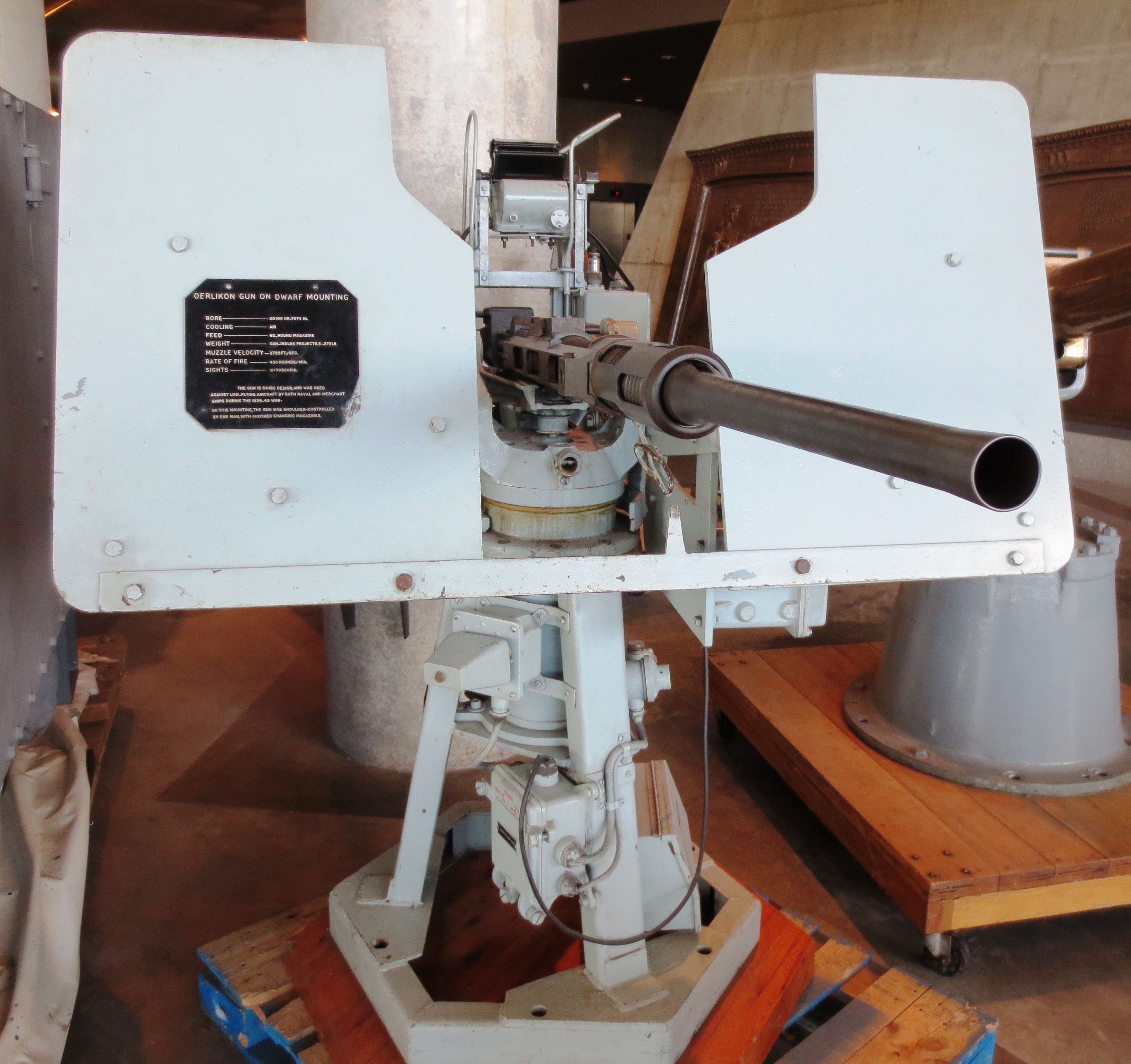 Oerlikon 20-mm/70 Mk. 4 Light Anti-Aircraft Gun on an RCN Mk. V Mounting. The 20-mm Oerlikon heavy machine gun was produced in higher numbers than any other antiaircraft weapon of the Second World War. The US alone manufactured 124,735 guns. Starting in1939, Oerlikons were mounted on almost every class of ship in the British and Commonwealth navies, including many merchant ships, and there were 55,000 guns in service in those navies in September 1945. It was easy to maintain and had a good rate of fire. However, in the Pacific, it was unable to defeat Japanese Kamikaze attacks and was replaced by the 40-mm Bofors gun. The CWM artefact is mounted on a Mk V (RCN) mounting (CAN 452), which was manufactured by Regina Industries Ltd, in Regina, Saskatchewan in 1943. The company manufactured more than 500 twin and 1,200 single mounts during the war. CWM 19590026-002.