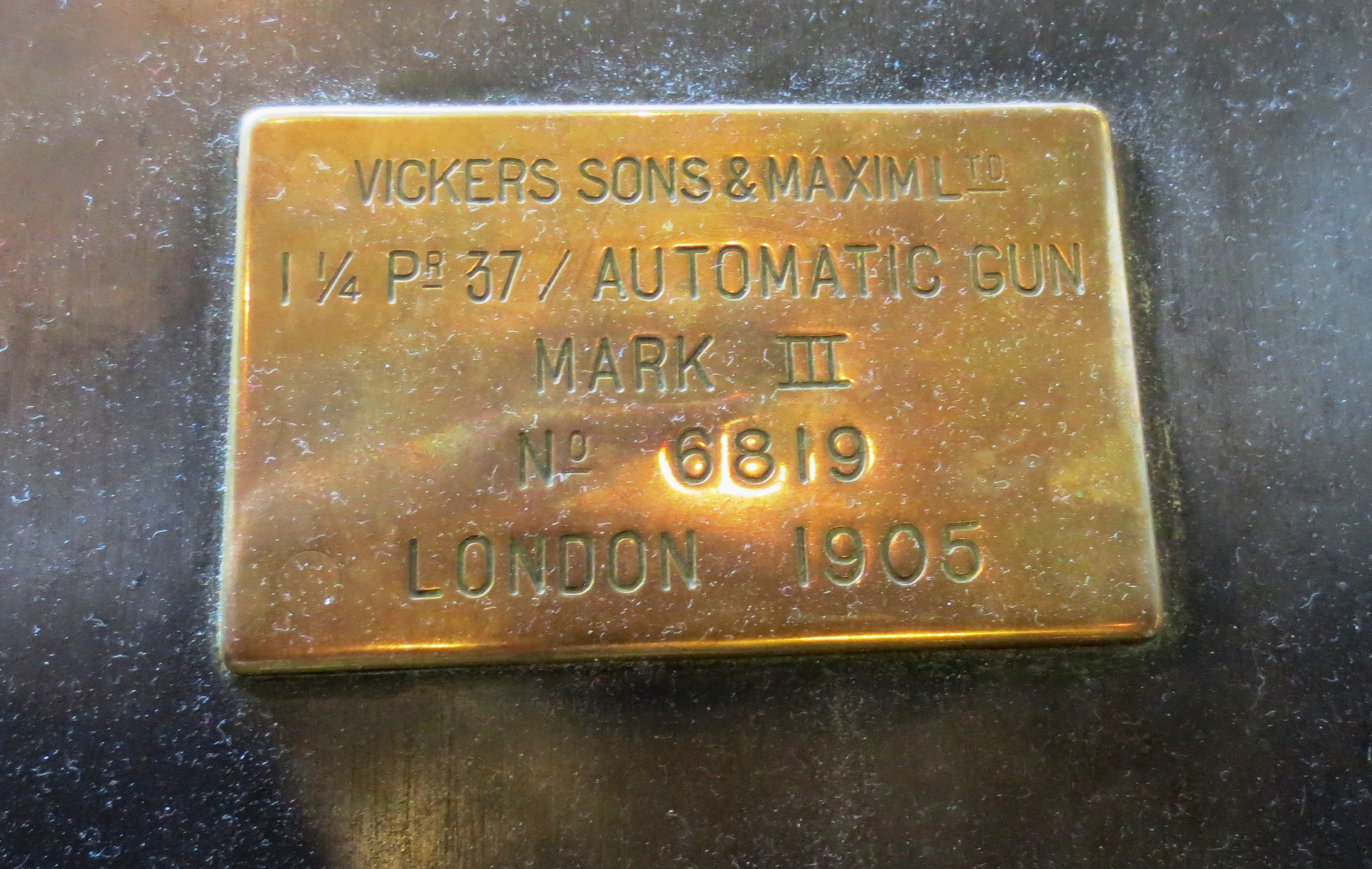 Vickers, Sons & Maxim Ltd 1¼-pounder 37/Automatic Gun Mk. III, (Serial No. 6819), London, 1905, aka “pom-pom”, from CGS Canada. This Vickers-Maxim 1¼-pounder (gun number 6819) was manufactured in 1905 and mounted on the Canadian Fisheries Service vessel CGS Canada from approximately 1902 to 1914. The Canada was a similar to a fast naval sloop of the period. Vickers Sons and Maxim, at Barrow-in-Furness, built her in 1904. Canada was 200 feet long, could steam at 22 knots, was armed with four small quick firing guns, and carried a complement of 75 officers and men. (Fisheries and Oceans Canada)The Canada marked the transition from traditional wooden schooners to modern steel cruisers, playing a crucial role as Canada formulated its young navy. Canada was the fastest ship in the Fisheries Protection fleet. It was Canada’s first successful naval training vessel, and the first Canadian naval vessel to train with the Royal Navy. She was sold to the Florida Inter-Island Steamship Company in 1924, and sank under mysterious circumstances on 2 July 1926. CWM 19440021-001.