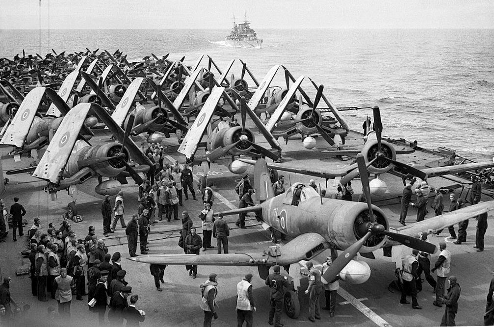 Corsair fighters and Fairey Barracuda torpedo bombers ranged on the flight deck of HMS Formidable off Norway in July 1944.