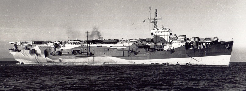 HMS Nabob (D77), off the coast of California during her post-modification workup with Grumman Avenger torpedo bombers of No. 852 Squadron, March 1944.