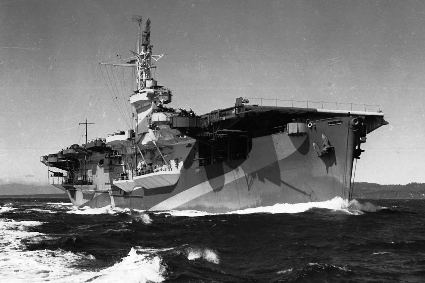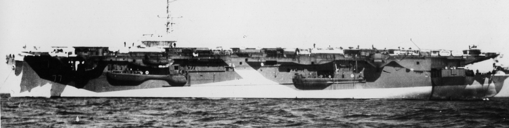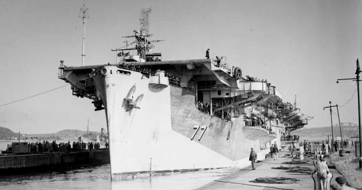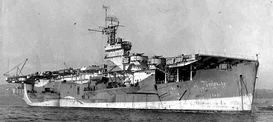 HMS Nabob (D77).  On 22 August 1944, while returning from a strike against the German battleship Tirpitz (Operation Goodwood), she was torpedoed by U-354 in the Barents Sea and sustained heavy damage.  The damaged carrier is shown steaming under her own power for Scapa Flow.  At 01.14 hours on 22 Aug 1944 the U-boat fired a spread of FAT torpedoes and hit the HMS Nabob (D 77) with one torpedo in the starboard side aft, resulting in a hole about 32 feet square located aft of the engine room and below the waterline.  At 01.22 hours, the U-boat fired a Gnat to finish off the carrier, but struck the HMS Bickerton (K466) instead, which was about to begin refueling the escort carrier at the time of the attack.  The frigate was subsequently scuttled by a torpedo from the HMS Vigilant (R93).