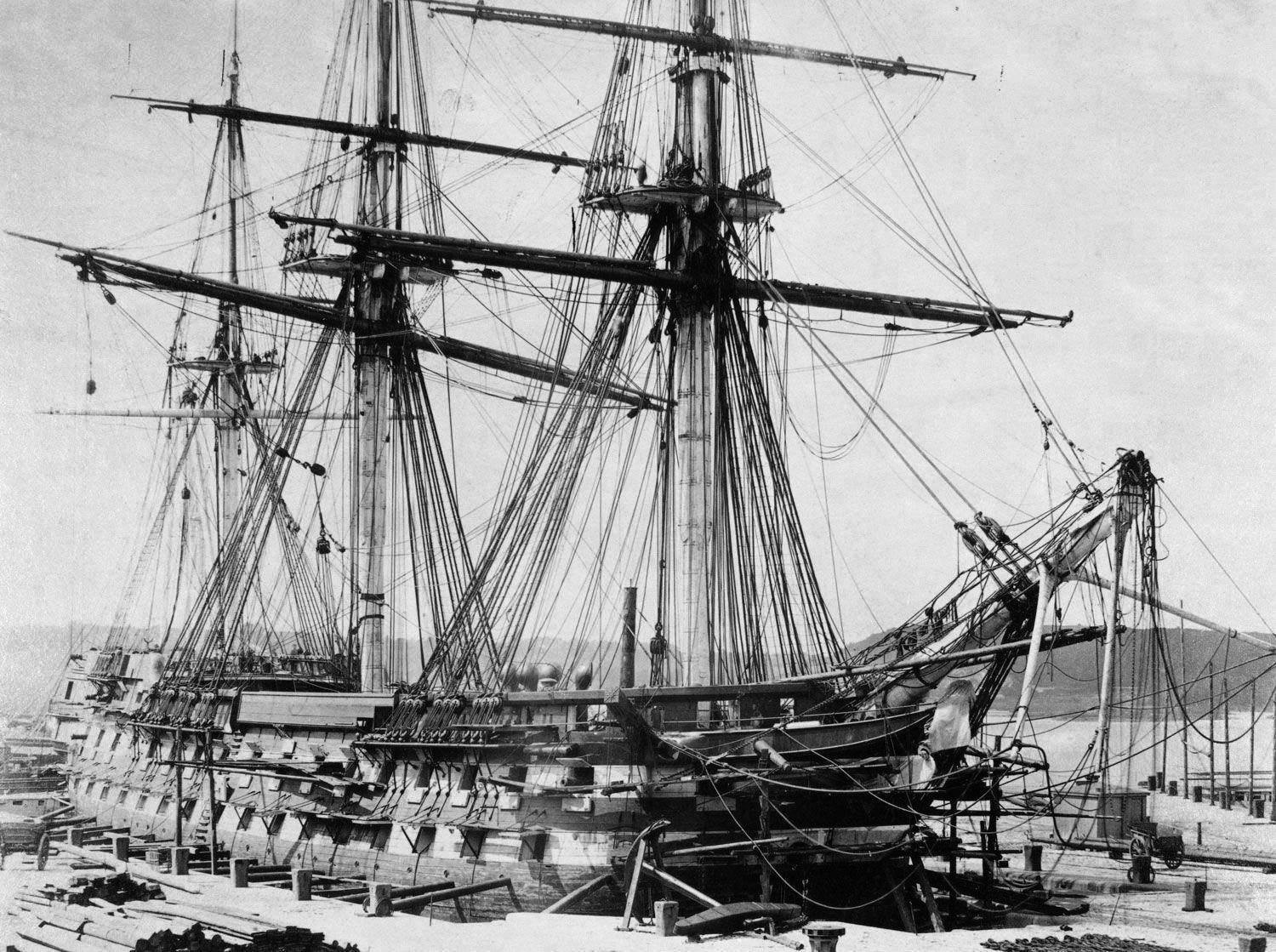 The Royal Navy ship of the line HMS Hannibal in Deptford Dockyard in 1853. Originally planned as a 90-gun ship of the line, she was ordered in 1840 but was cancelled. She was re-ordered and finally launched on 31 January 1854. She participated in the Crimean War and transported Giuseppe Garibaldi’s men to Naples in 1860 during the Italian unification.