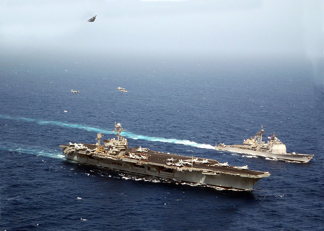 USS Constellation (CV 64) and USS Kitty Hawk (CV 63) steam alongside one another. 13 April 2003.