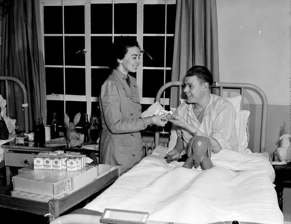 Welfare Officer Dorothy Brooks of the Canadian Red Cross distributingcigarettes to Able Seaman I.M. Barnes at No. 11 Canadian General Hospital, RoyalCanadian Army Medical Corps (RCAMC), Taplow, England, 14 December 1944.