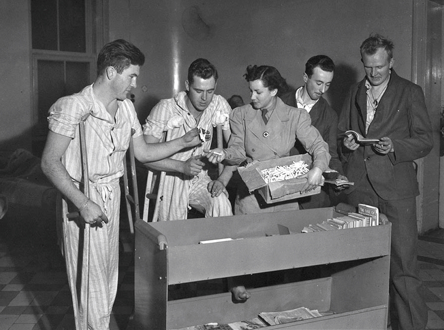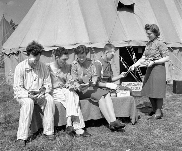 Red Cross nurses giving cigarettes and reading materials to convalescing Canadian soldiers at No.8 Canadian General Hospital, Royal Canadian Army Medical Corps (RCAMC), Bayeux, France, 25 August 1944.