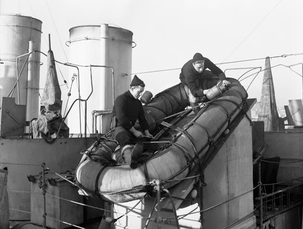 RCN sailors wearing woolen clothing supplied by The Canadian Red Cross Society, making a Carley raft ready for sea aboard a ship of the Royal Canadian Navy, Halifax, Nova Scotia, 5 February 1943.