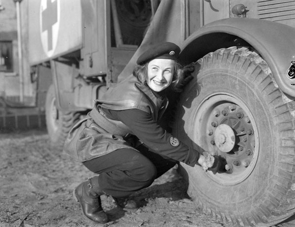 Canadian Red Cross Ambulance (St John’s Ambulance) driver Salley MacKean, checking air pressure, 4 Feb 1945.
