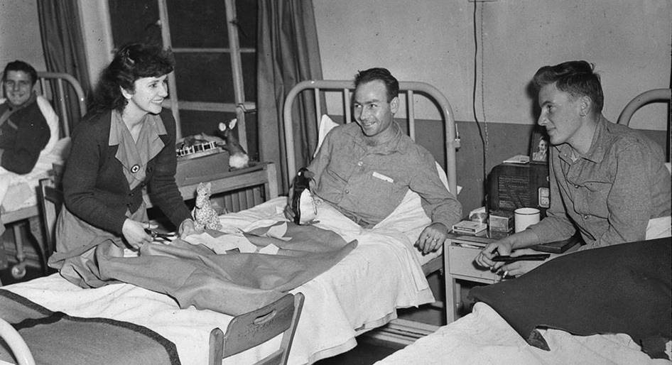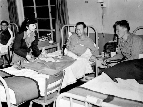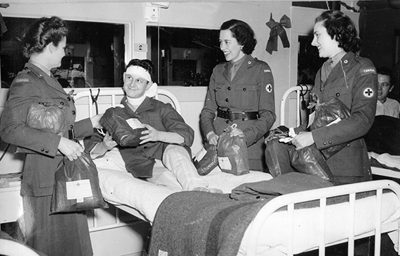 Three CRCC Welfare Officers visit a convalescing soldier overseas (ca. 1943-45) while distributing “ditty bags” on a hospital ward.