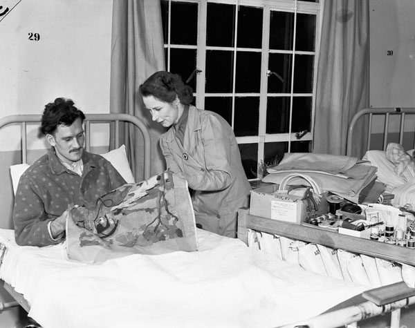 A Canadian Red Cross Society worker distributing craft supplies to patients at No.7 Canadian General Hospital, Royal Canadian Army Medical Corps (R.C.A.M.C.), Marston Green, Birmingham, England, 19 November 1943.