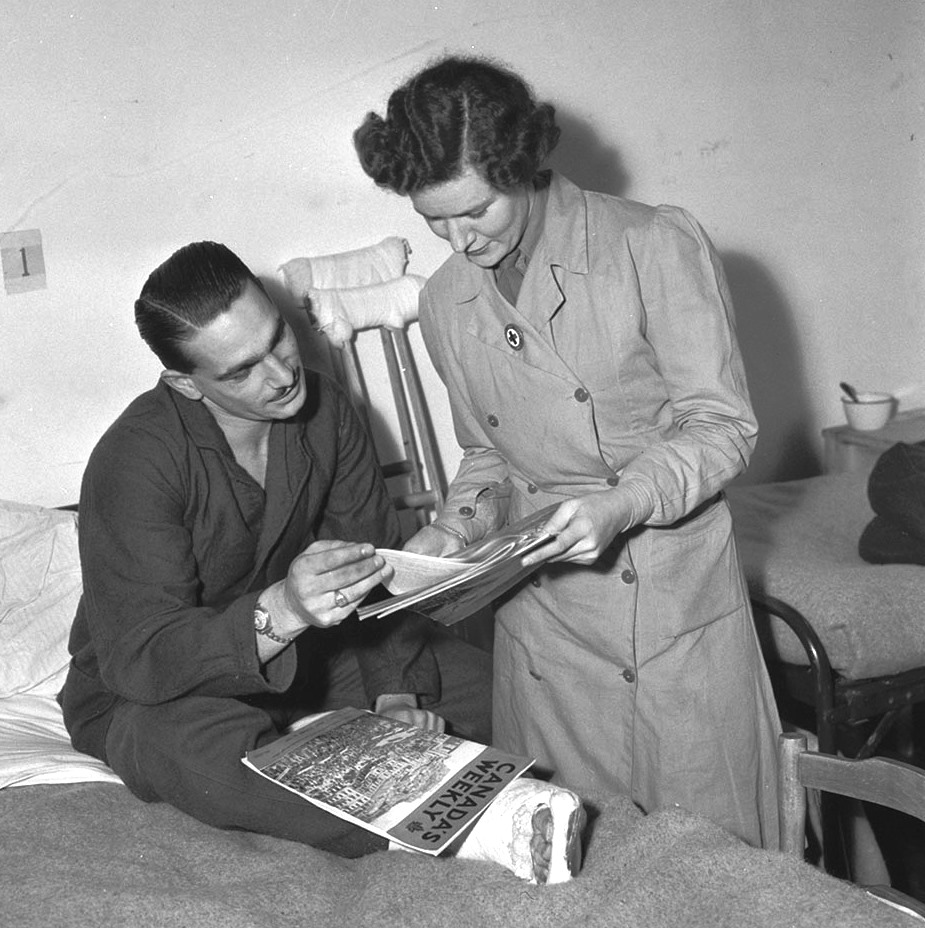 Senior Welfare Officer Dorothy King of the Canadian Red Cross delivering copies of Canada’s Weekly to Signalman N.L. Grant at No.2 Canadian General Hospital, Royal Canadian Army Medical Corps (RCAMC), Ghent, Belgium, 11 December 1944.