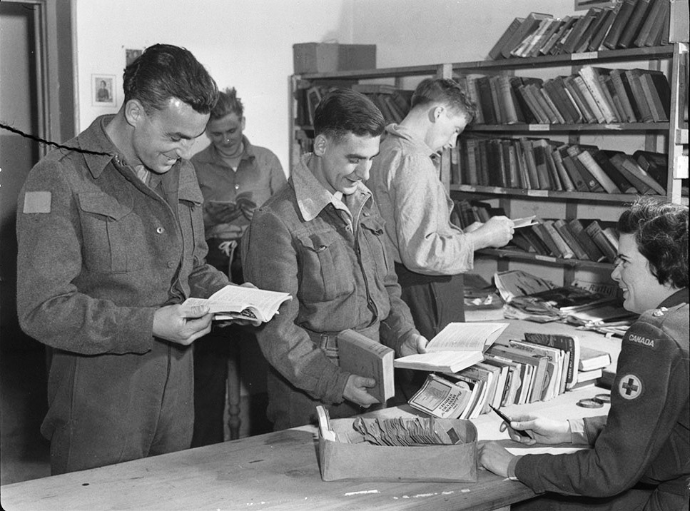 Welfare Officer of the Canadian Red Cross assisting patients using the library of No. 1 Canadian General Hospital, Royal Canadian Army Medical Corps, Andria, Italy, 2 April 1944.