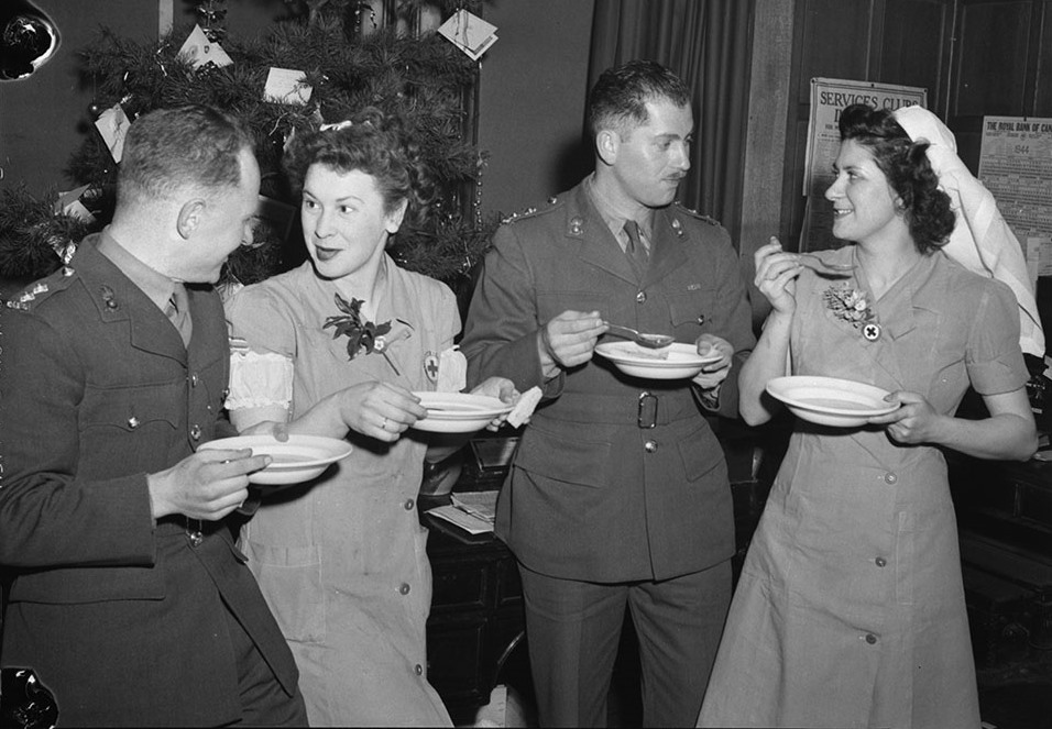 Lieut. H.N. Young, R.C.A., Faith Watson, Canadian Red Cross Society, Lieut. L.L. Langsner, R.C.A., and Margaret Gilbert, Canadian Red Cross Corps at Maple Leaf 2 Club, 25 December 1943.