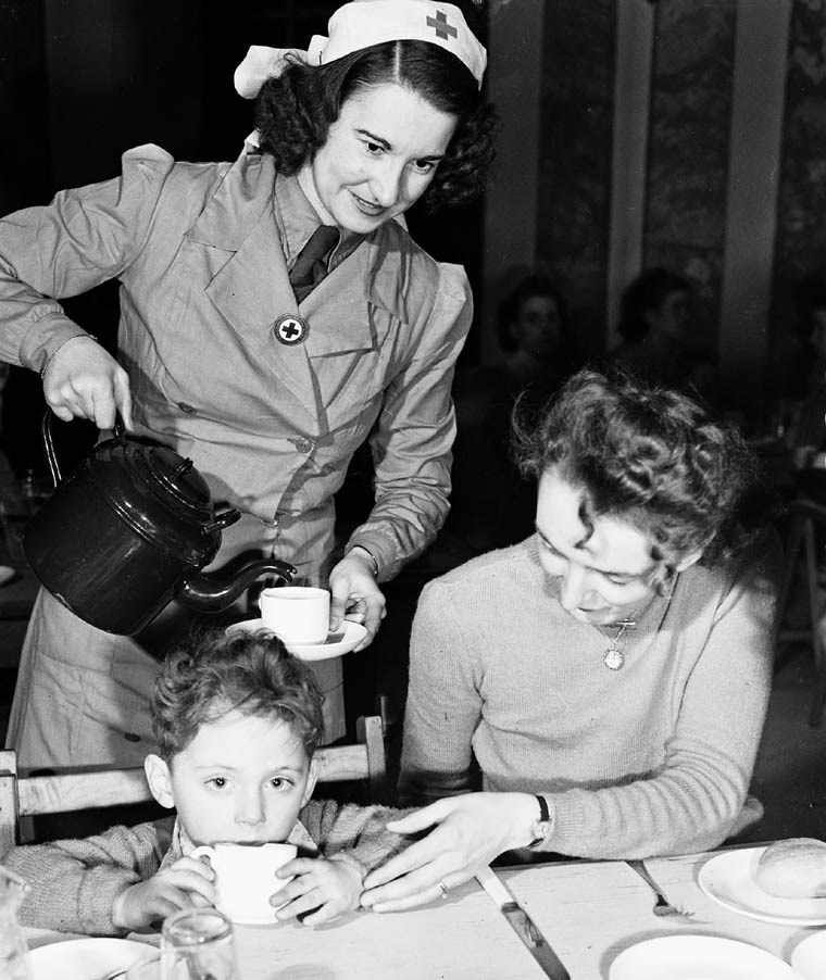 Sally Cuthbert of the Canadian Red Cross pouring tea for Mrs. Ivan McArthur, a war bride, and her son Robert, who are en route to Canada to join Mr. McArthur, 4 Feb 1946.