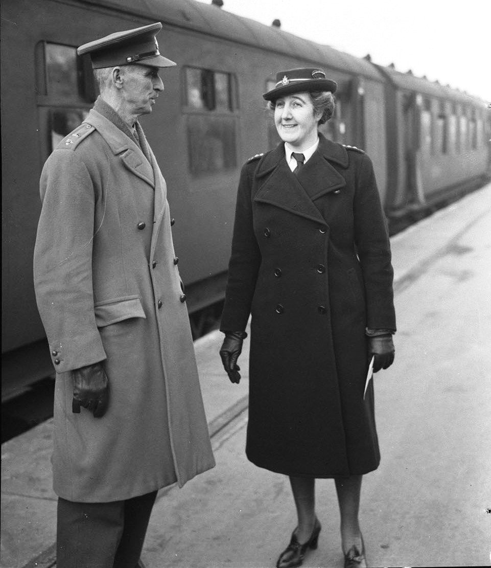 Lieutenant-Colonel D.A. Clarke of the Canadian Wives’ Bureau and Miss M. R. Duff of Canadian Red Cross Hostels at train taking Canadian war brides and children to Liverpool en route to Canada, 4 Dec 1944.