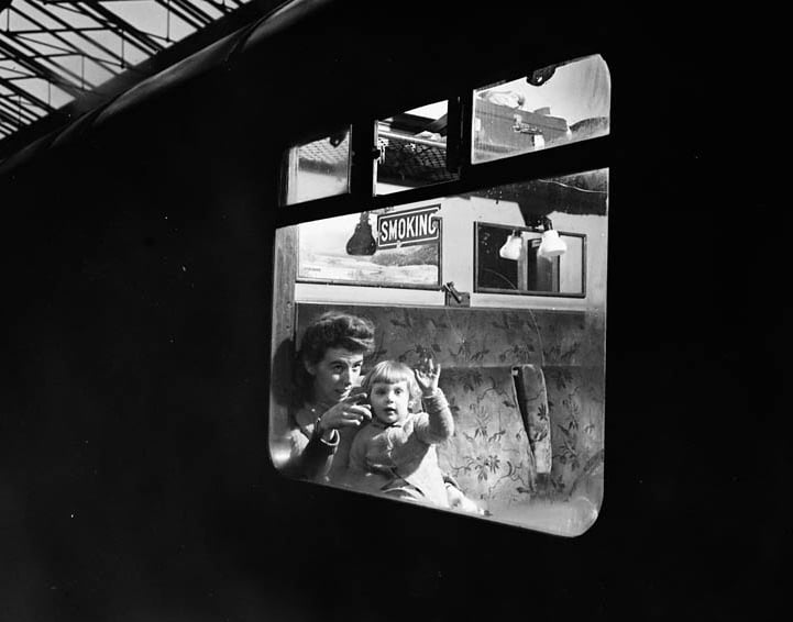 Mrs. Elizabeth Rae and daughter Anne aboard the train taking them to Liverpool, where they are to embark on the S.S. Mauretania as part of the first large group of British war brides to sail to Canada, 4 February 1944. This photo was taken by Sgt. Karen Hermeston, a photographer with the Canadian Film and Photo Unit (CFTU) who was tasked with documenting the FIRST official War Bride sailing on the SS Mauretania. The Mauritania brought 900 brides and children to Canada on that sailing.