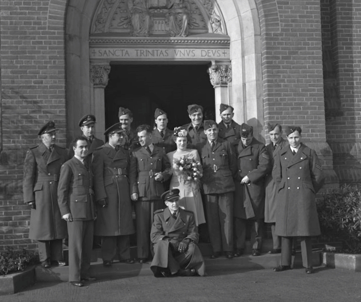 This photograph of a group of R.C.A.F. Officers and N.C.O.’s was taken at Sutton Coldfield, in England, outside of the church of Holy Trinity, after the wedding of W.O. 1 J.J. Deslauriers to Miss Mary Connon. These officers and airmen are all members of the famed Alouette Squadron, of which Deslauriers is Chief Warrant Officer. From left to right: first row: F/L Claude Bourassa, the groomsman; F/O Rosaire Garneau, W.O. 1 J.J. Deslauriers and Mrs. Deslauriers; kneeling in front of the newlyweds, Flight Lieutenant Real St. Amour, adjutant of the French-Canadian squadron; at the right of Mrs. Deslauriers, Corporal Cuillerier, Sgt. Barnes, Warrant Officer Bill McCullough and Corporal Mac; last row, from left to right, Flying Officer Gabriel Langlais, Flying Officer Jean Paul Camire, Sgt. Demontigny, F/S Bud Regnier and Guy Chartier. 425 Squadron, Dishforth, England, 2 November 1944.