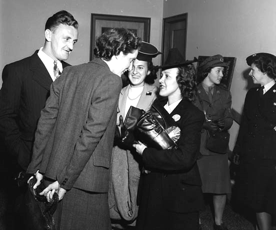 Leading Wren Evelyn Kerr (right) of the Women’s Royal Canadian Naval Service (WRCNS) interviewing British wives of Canadian sailors, Canadian Wives Bureau, London, England, 30 November 1944.