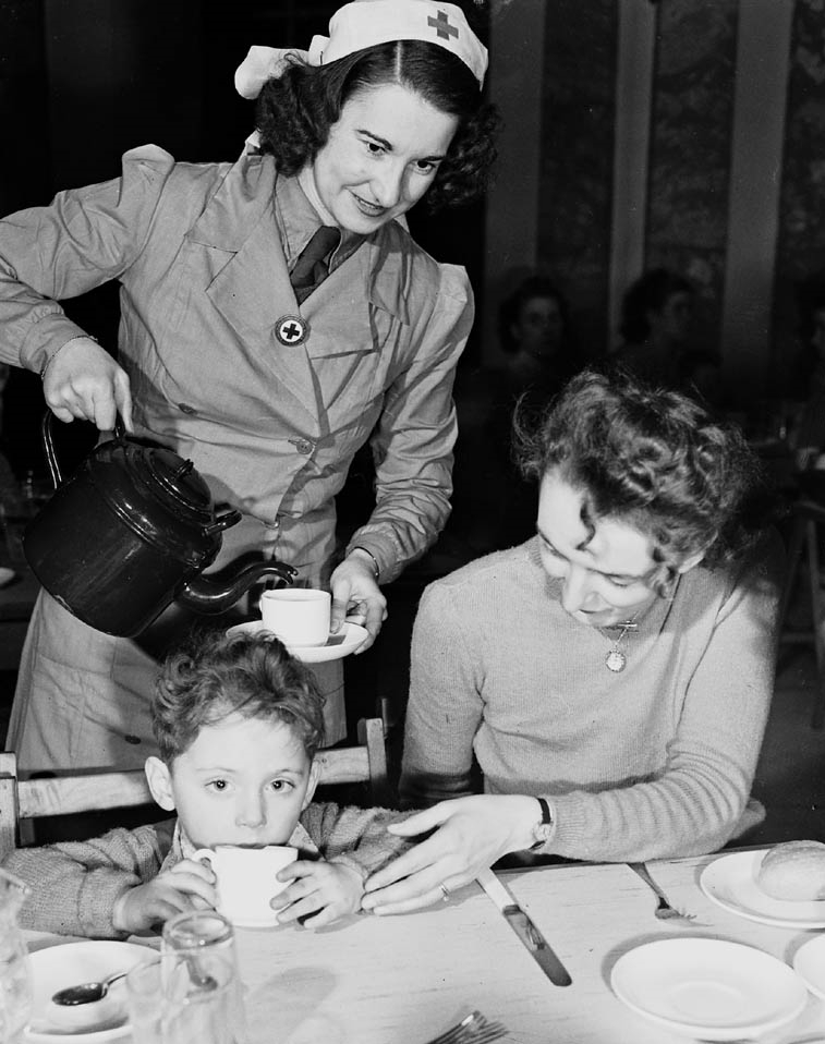 Sally Cuthbert of the Canadian Red Cross pouring tea for Mrs. Ivan McArthur, a war bride, and her son Robert, who are en route to Canada to join Mr. McArthur, 4 February 1946.