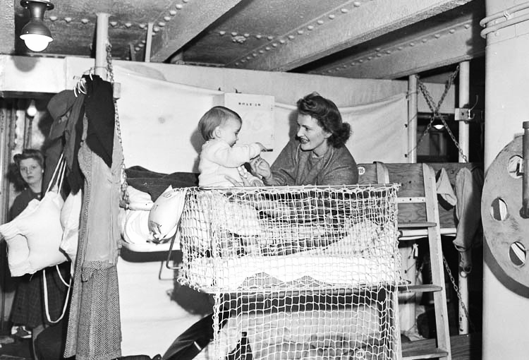 Mrs. J.W. Perry, a war bride, and her daughter Sheila aboard S.S. Letitia en route to Canada, 2 April 1946.