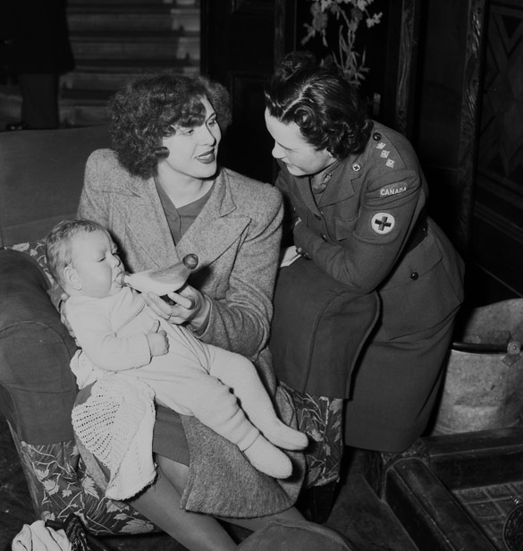 Red Cross Assistant Matron Kathleen Hurley helping war bride Mrs. H.F. Whitmore and her son Mervin, who are en route to Canada. Maple Leaf Club, London, England, 4 December 1944.