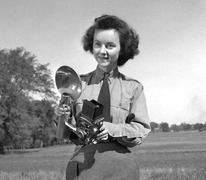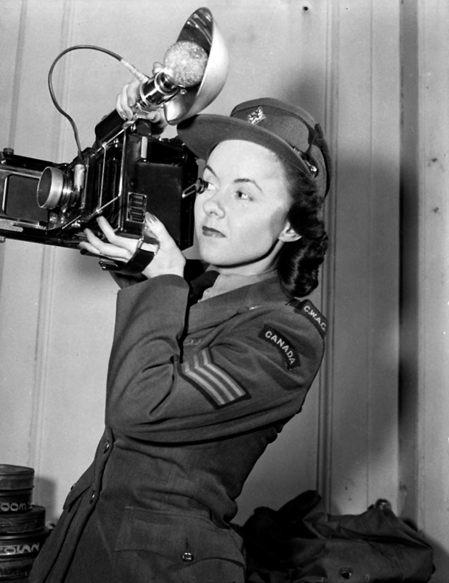Canadian Women’s Army Corps, Sergeant Karen M. Hermiston holding a Rolleiflex camera.