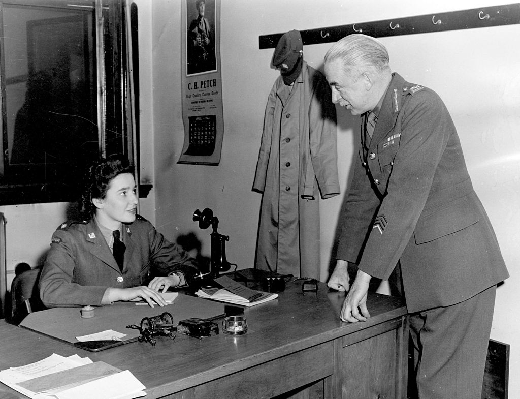 Lieutenant-General Kenneth Stuart speaks to a member of the Canadian Women’s Army Corps
