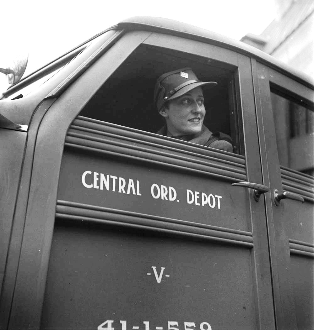 CWAC driver with Central Ordance Depot vehicle, Dec 1941.