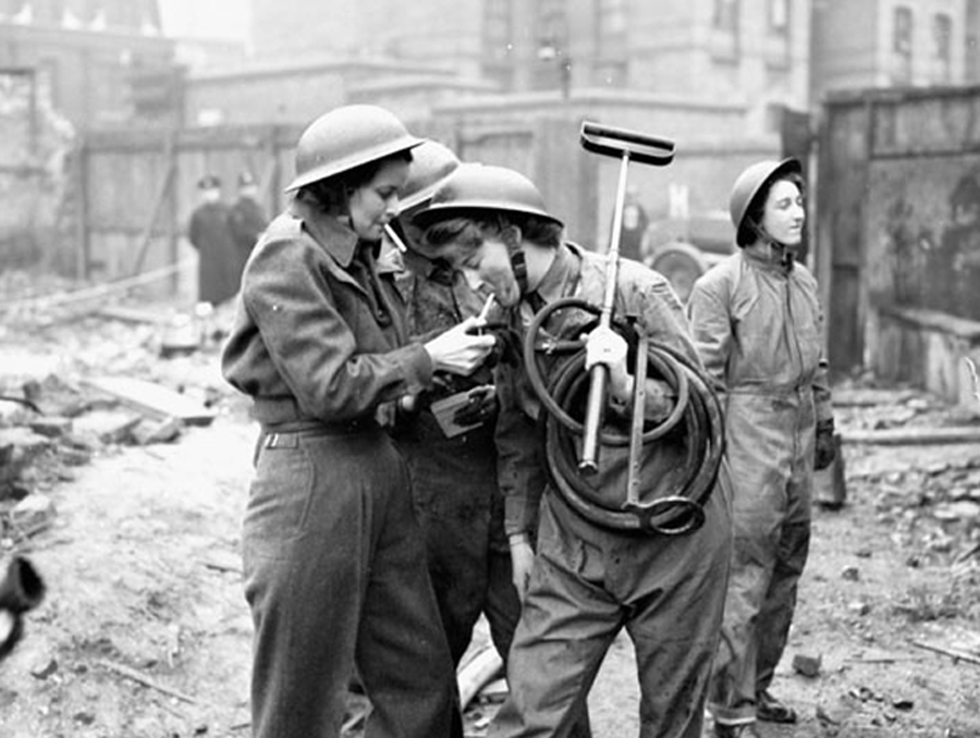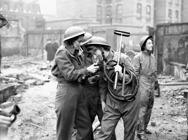 Personnel of the Canadian Women’s Army Corps (CWAC) taking part in a firefighting exercise, London, England, 28 February 1943.