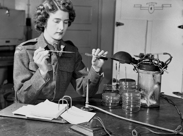 CWAC Private conducting tests during the Respiratory Disease Control Program, Camp Borden, Ontario, Canada, ca. February-March 1944.