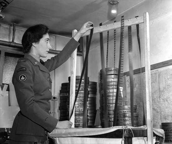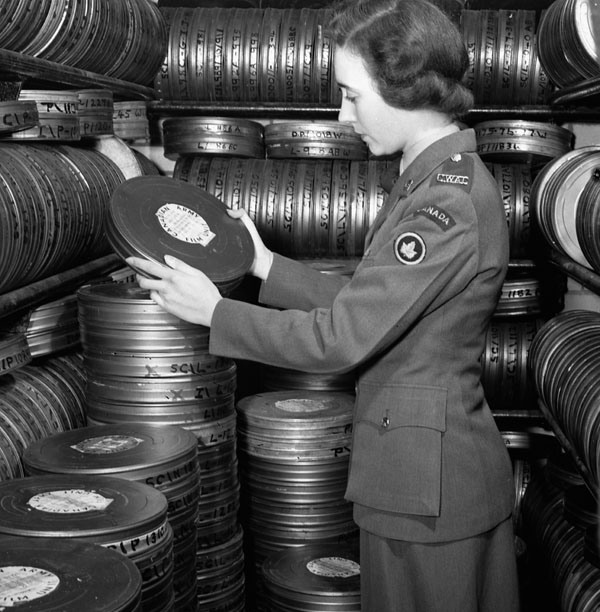 Private Nadine Manning of the Canadian Army Film and Photo Unit in a film vault at Merton Park Studios, London, England, 19 December 1944.