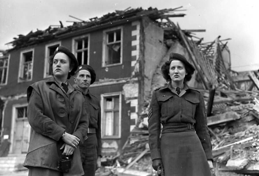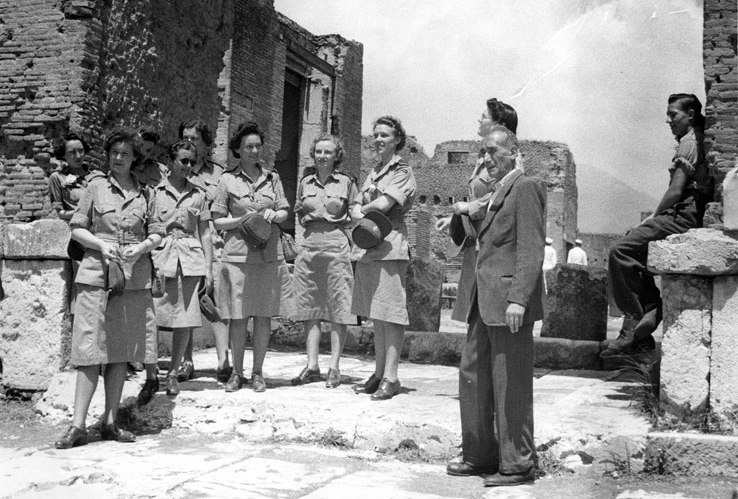Members of the Canadian Women’s Army Corps touring battlefield ruins in Italy, 1944.